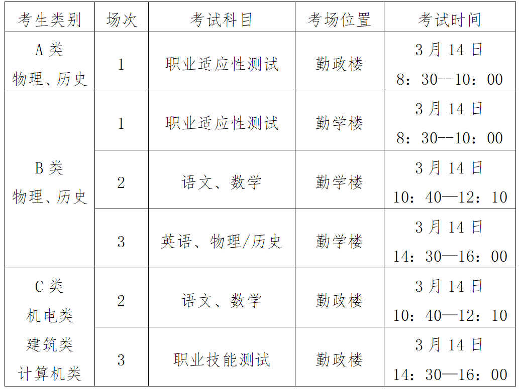 包头铁道职业技术学院2026年单招所有考试科目都集中在3月14日,各类别考生考试场次、考试科目、考场位置、考试时间详见下表: