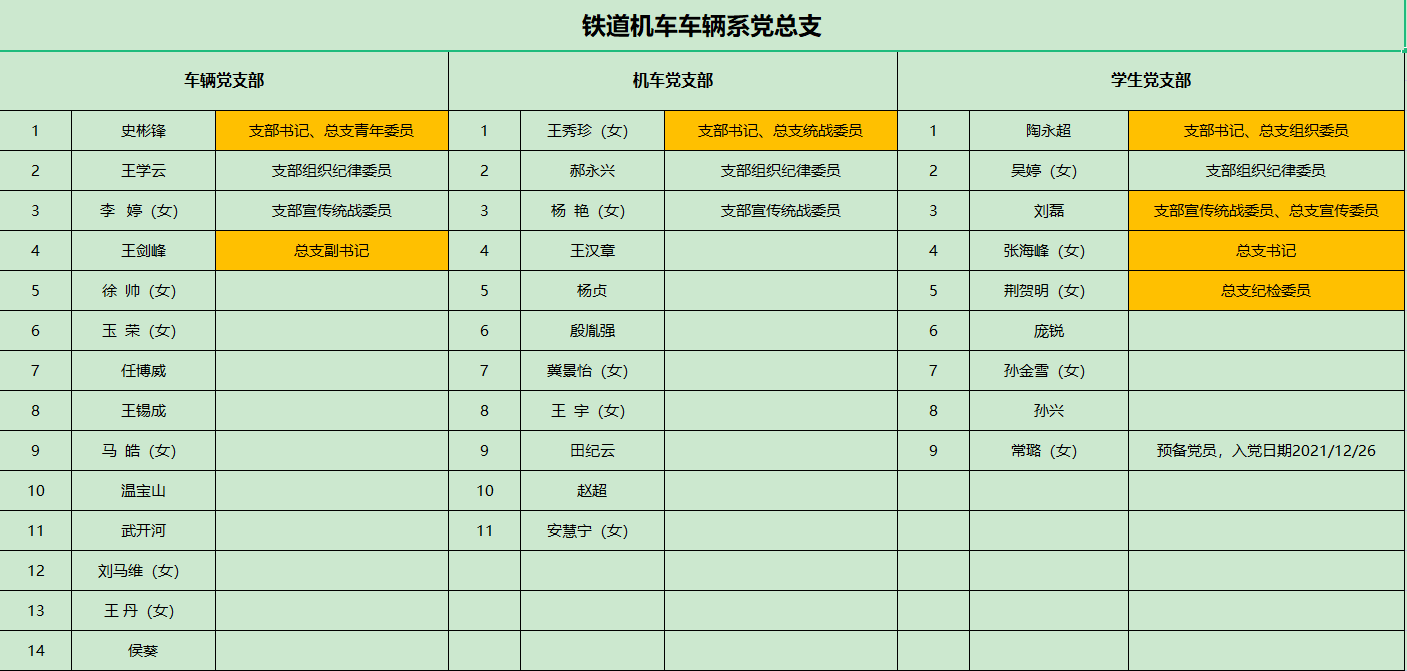 铁道机车车辆系党总支下设机车、车辆、学生3个党支部。现有党员34人,其中女党员16人,少数民族党员6人,副高以上职称8人,讲师16人。 机辆系党总支坚持以习近平新时代中国特色社会主义思想为指导,以学习贯彻党的二十大精神为主线,以党建引领业务工作为核心,全面贯彻落实习近平总书记重要讲话重要指示批示精神,特别是对内蒙古重要讲话重要指示批示精神,深入学习贯彻习近平总书记对教育的重要论述、对职业教育工作的重要指示,践行“三个务必”,做到“三个牢记”,不断强化自身建设,激发自身活力,党员思想素质过硬,业务能力突出。 近年来,机辆系党总支坚持不懈抓好意识形态教育,务求思想引领实效,夯实理想信念基石,不断推进“不忘初心、牢记使命”主题教育常态化、制度化建设;统筹推进“双高”建设、提质培优、“三全育人”、职业本科试点专业建设等重点工作;积极推进专业课程与课程思政相互融合,转变单纯专业知识传播的观念,教学过程除了传授学生专业知识、培养学生专业能力外,更突出思想政治教育功能。 同时系党总支不断加强组织建设,强化标准化建设、提升组织力、发挥政治引领力,指导各支部严格组织培养发展程序,按时完成全系党费收缴及党员信息录入工作,认真完成“三会一课”组织生活和主题党日活动,签订党风廉政责任书,落实党组织会议“第一议题”学习制度。与中慧社区党支部确定“包头市城市基层党建互联互动需求清单”,精准帮扶包头市固阳县西斗铺镇刘伟壕村困难群众,充分发挥高校基层党支部工作战斗坚垒 作用。党总支连续多年被学院评选为先进党组织;机车党支部、学生党支部在2021年度评定为学院“最强党支部”。 党 总 支 书 记:张海峰 党总支宣传委员:王剑锋 党总支纪检委员:荆贺明 党总支组织委员:刘 磊 党总支统战委员:王秀珍 党总支青年委员:史彬锋