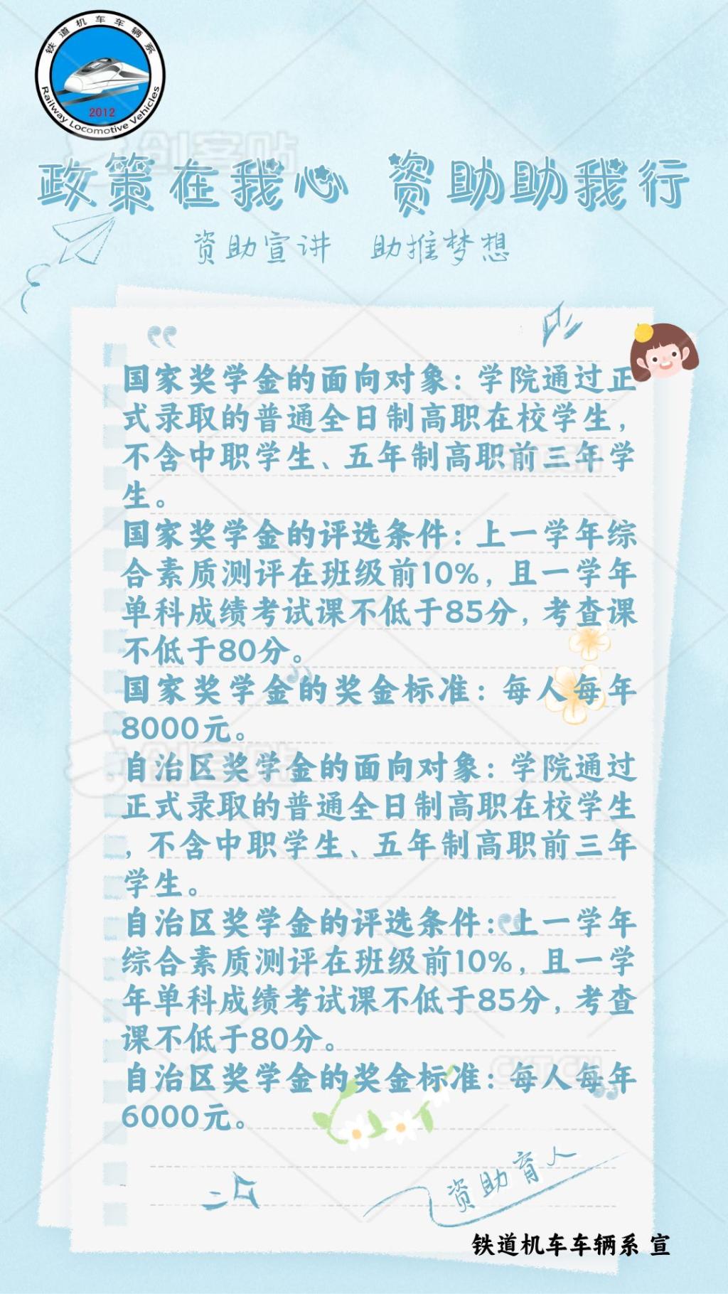 祖国寄希望于青年,寄温暖于青年。扶贫助学,健全资助政策体系,圆每一个孩子大学梦。宣讲员们阐明了国家、自治区资助政策的设立目的是关怀照顾家庭经济困难的学生并激励其勤奋学习、努力进取,助力他们在德、智、体、美、劳方面全面发展;同时,宣讲员们对各项资助政策的评选条件、奖金标准等进行详细讲解,具体如下: