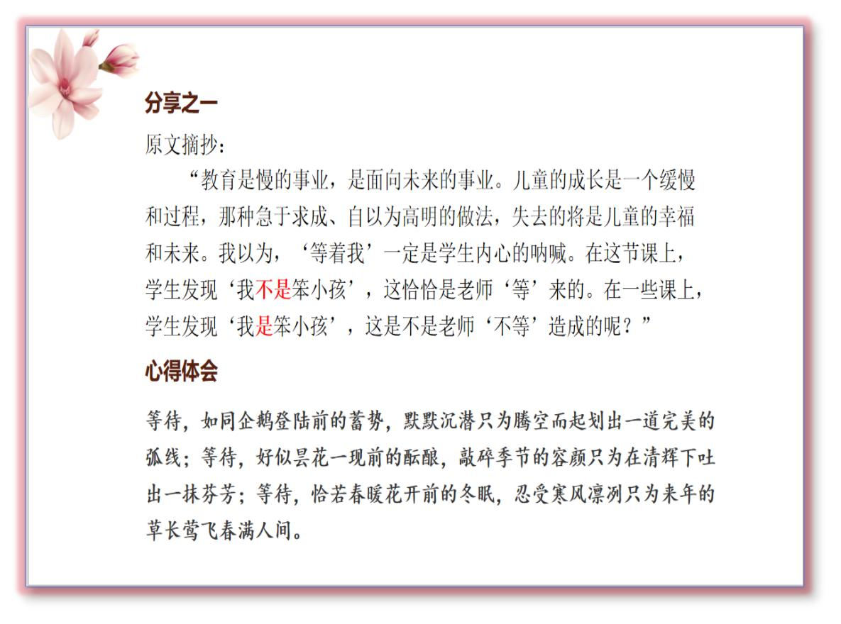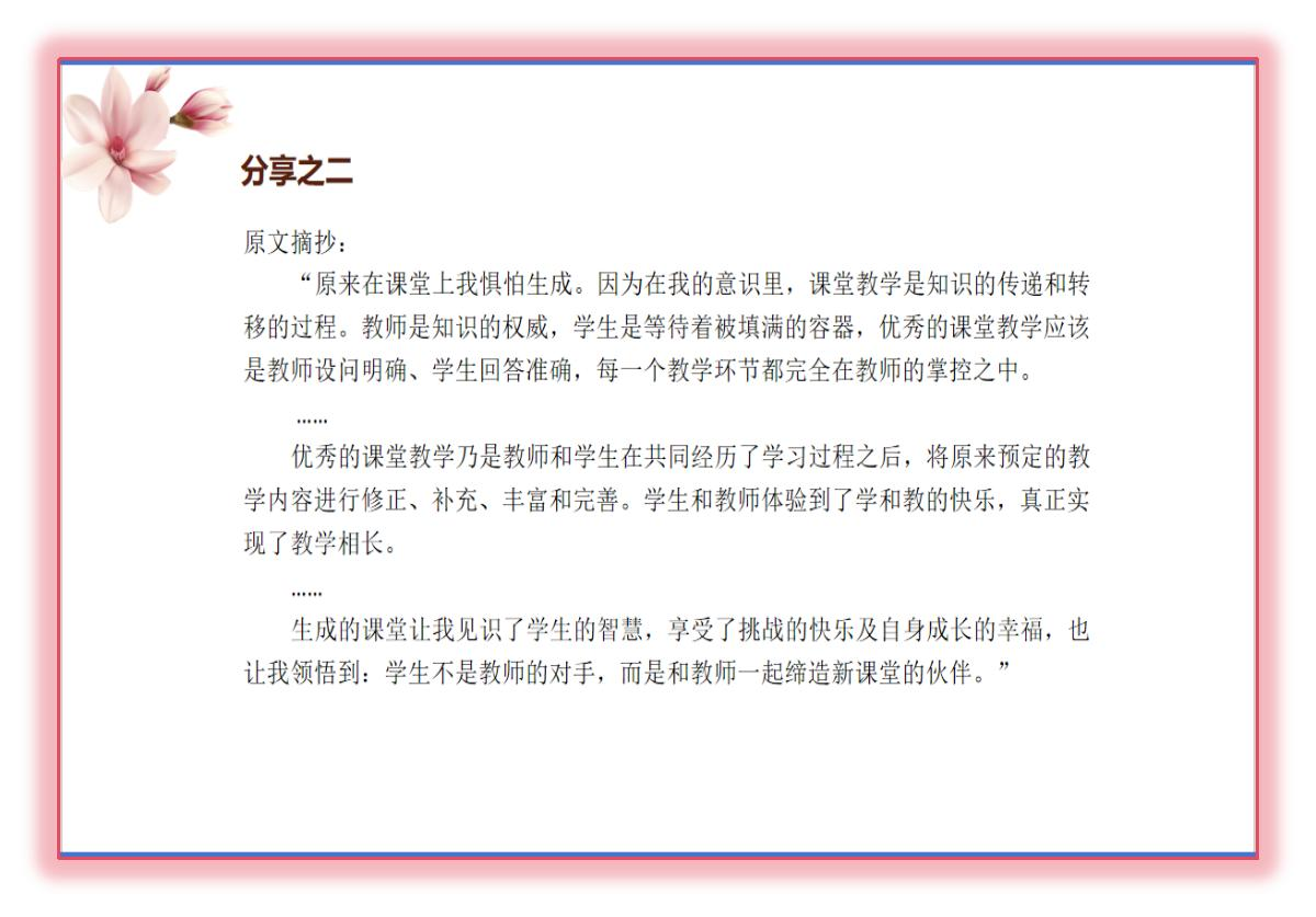 不管是对学生还是对教师而言,课堂上的所有节外生枝都是一种难得的教育资源。教师从中反思的不仅是知识技能的教学还有更重要的传递给学生关于人的教育。