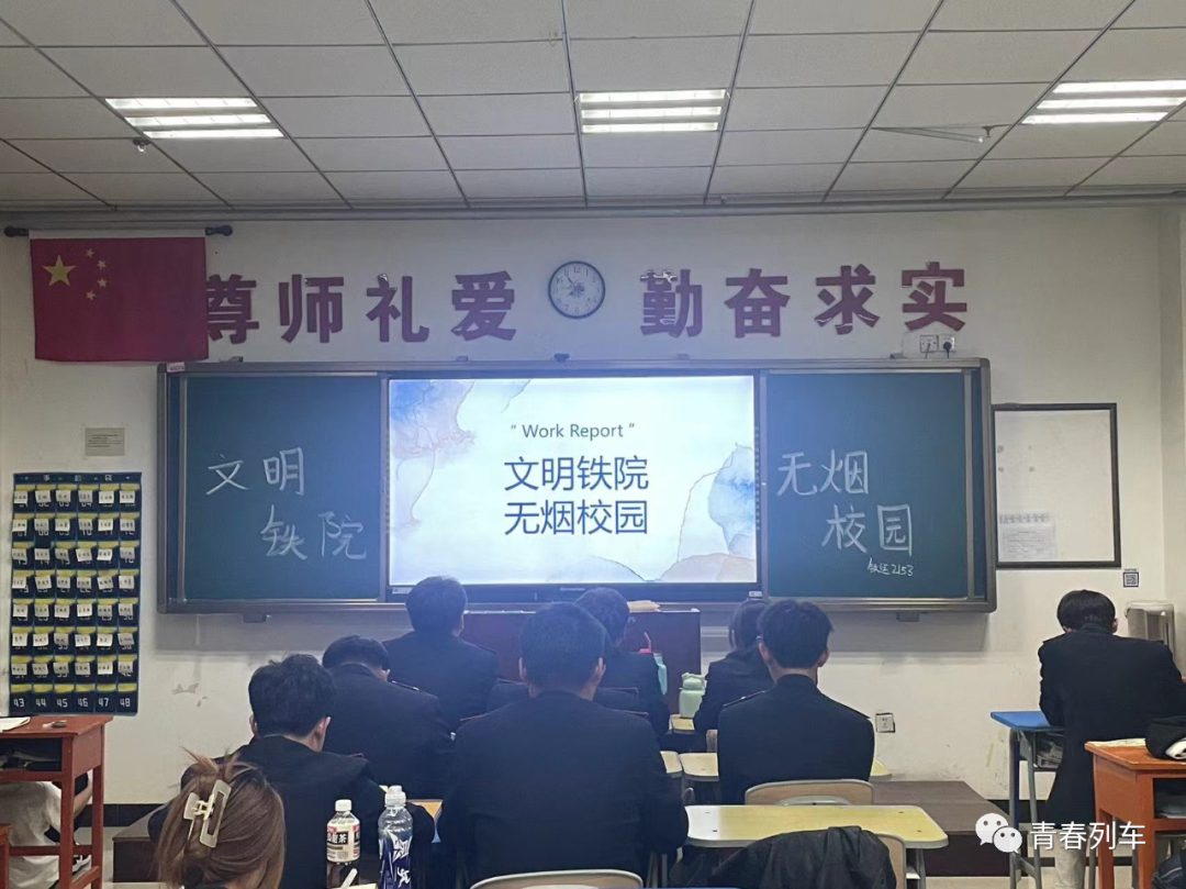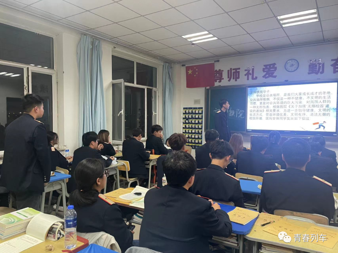 为推进我系“无烟校园”建设工作,使同学们了解烟草对人体的危害,树立远离烟草的意识,共同营造健康、清洁、文明、无烟的校园环境。高职铁道运输2153班于2023年9月25日晚自习开展了“文明铁院,无烟校园”主题班会。