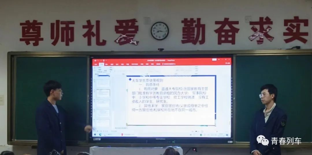 本次宣讲着重为同学们介绍了购买学生票的相关规定,其中包括购买对象、购票区间、购票流程、购票时的注意事项等。学生票可享受优惠以及不收取服务费等优惠政策,但需要同学们携带学生证和身份证进行优惠资质采集。在火车票代售点购票需要带齐相关证件以及现金,并告知目的地和出发时间,购票完毕后一定要核对个人信息以及购票信息。