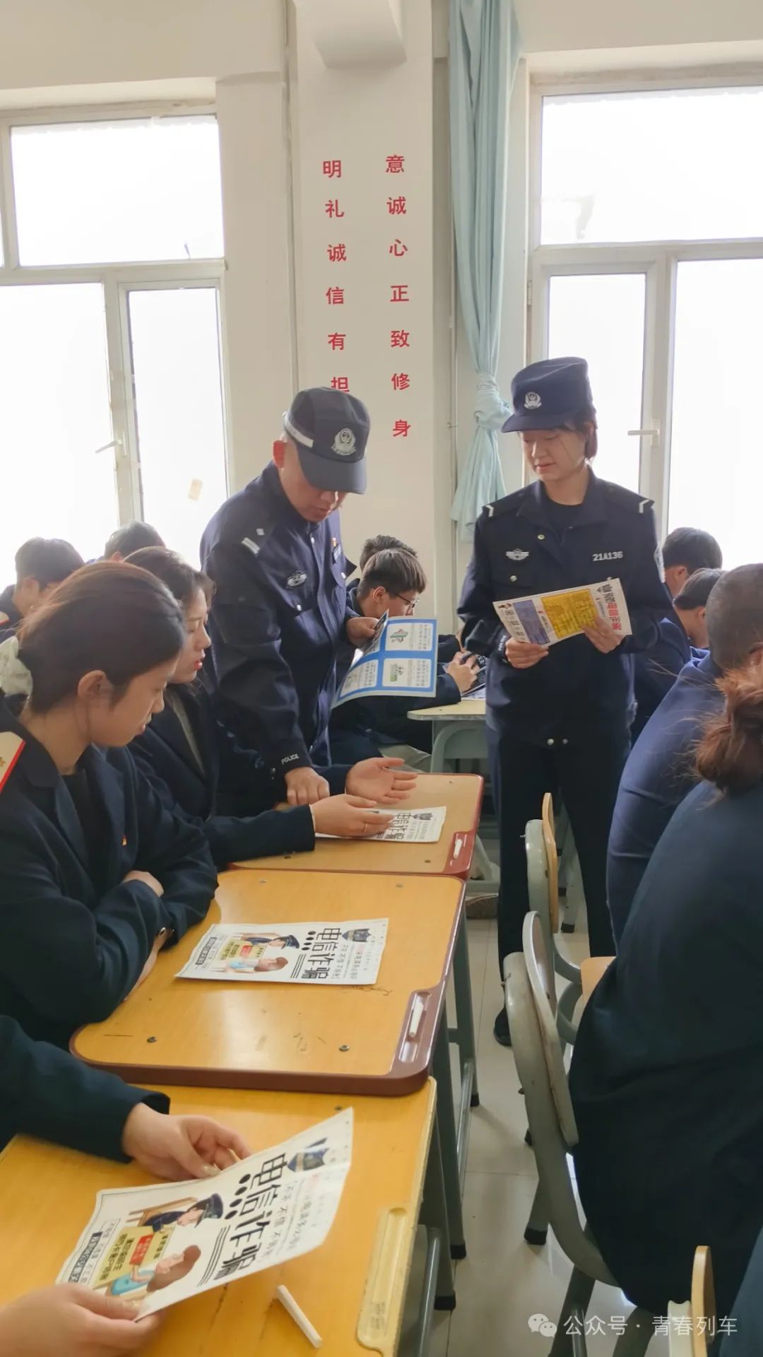 同时四位警官也分发给各位同学们国家安全宣传手册、预防电信诈骗宣传手册以及反恐怖分子宣传手册。各位同学接过手册后便认真阅览了起来,苏警官也引导大家,将每一页的内容都结合在自己的工作实例上,让同学们更能快速的了解、接收知识,将国家安全知识牢记于心。