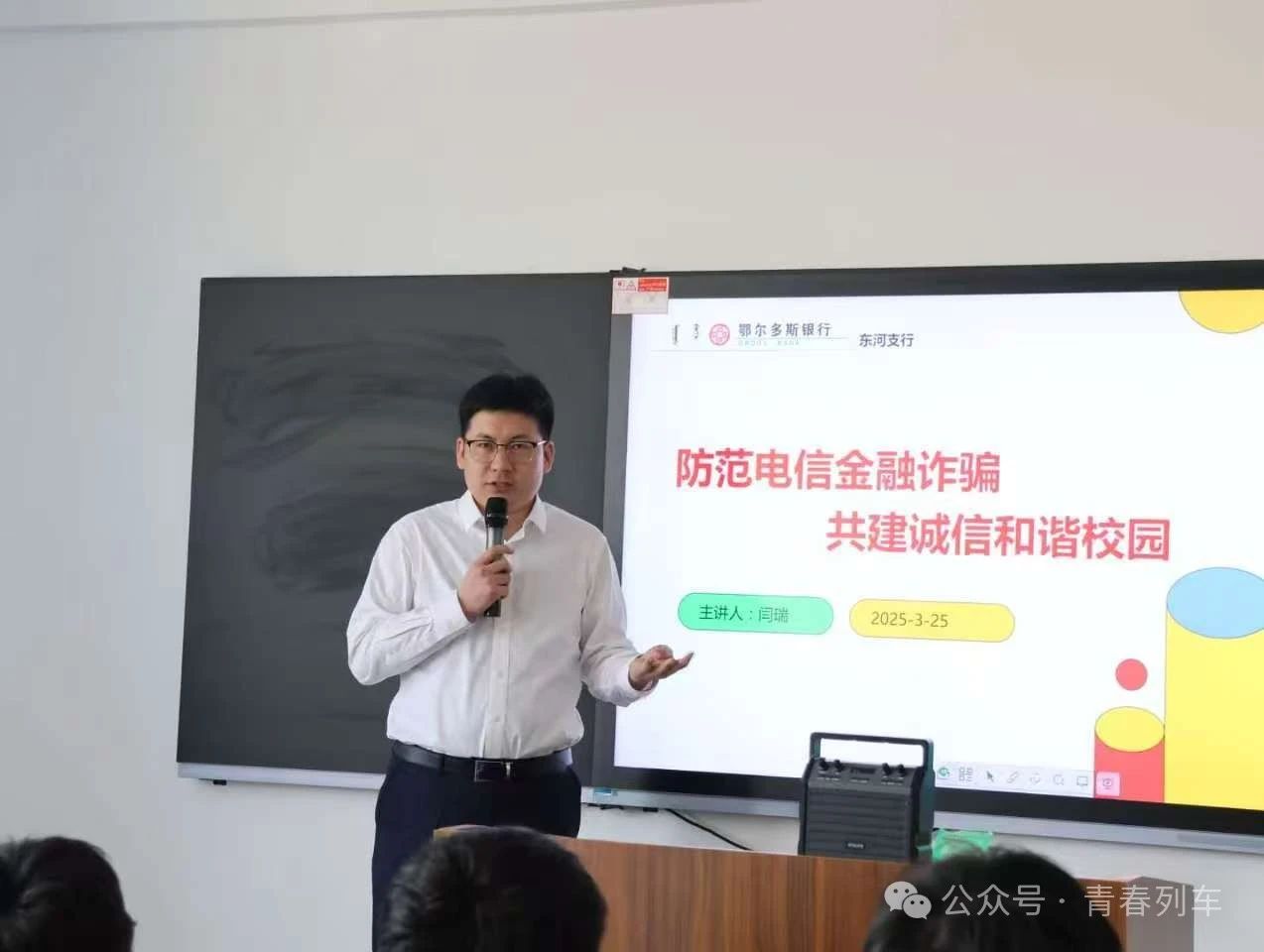 为进一步提升同学们的反诈意识,全力营造和谐稳定的校园环境。铁道交通运营管理系于3月25日下午在勤思楼362教室开展了“防范电信诈骗,共建和谐校园”安全系列讲座。本次讲座由我系张欢科长主持,此外还特别邀请到了鄂尔多斯闫瑞行长担任主讲嘉宾。