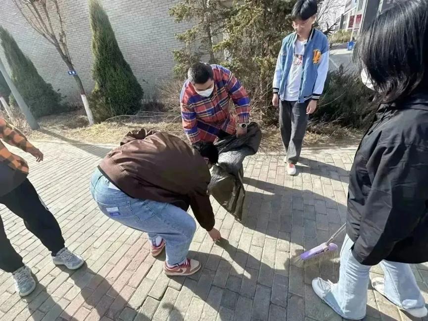 同学们提前准备了活动工具,在教学楼附近进行了环境卫生的清洁。负责人井然有序地安排工作,划分清洁小组及流动小组,多小组齐心协力共同完成了清扫任务。