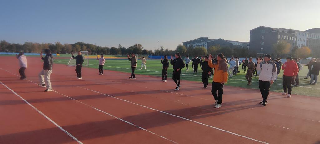 当清晨的阳光洒满校园操场,随着舒缓大气的太极拳音乐响起,包头铁道职业技术学院体育教学部的老师和学生们在李蓉蓉老师的带领下练习太极拳,一开一合蕴含太极风骨,一招一式尽显中华武魂。